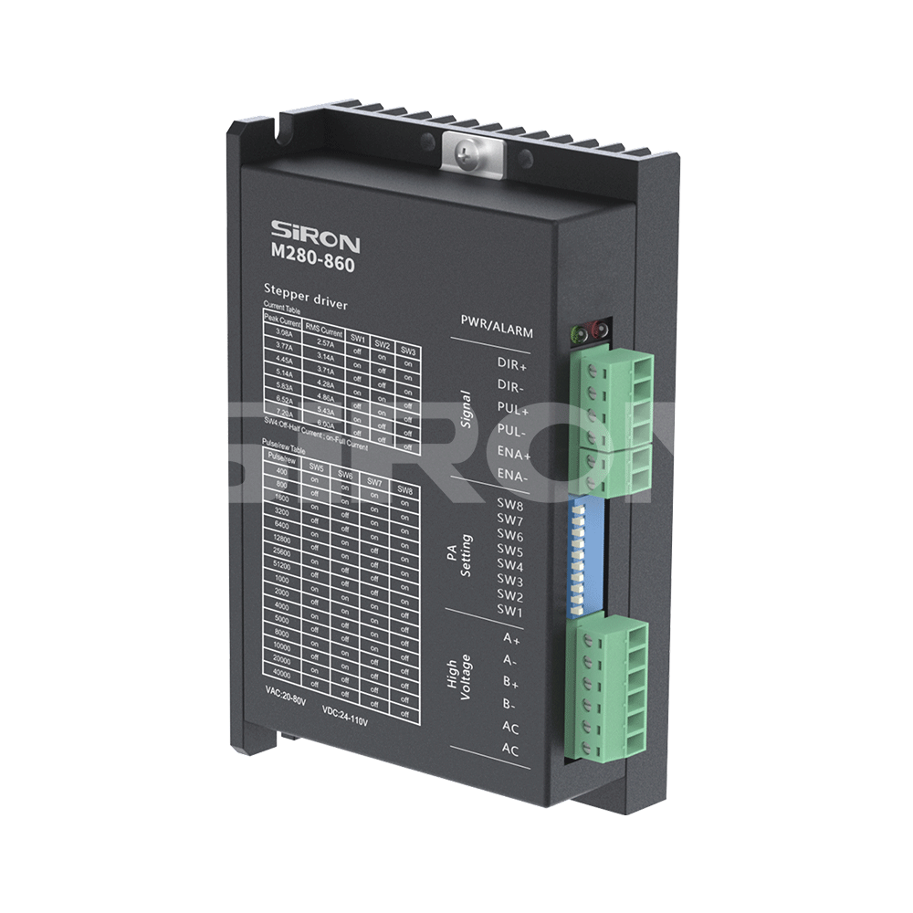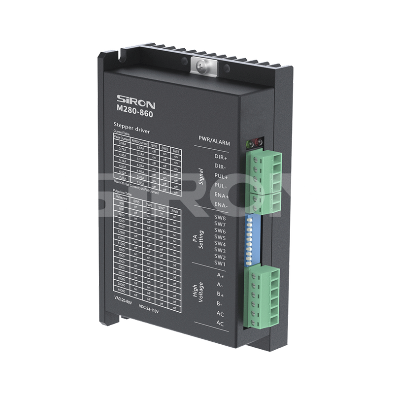 Selection example: M280-860 represents the M280 series two-phase open-loop stepping driver, with a ma ximum operating voltage of 80V, a maximum peak current of 6A, and a communication type of pulse.