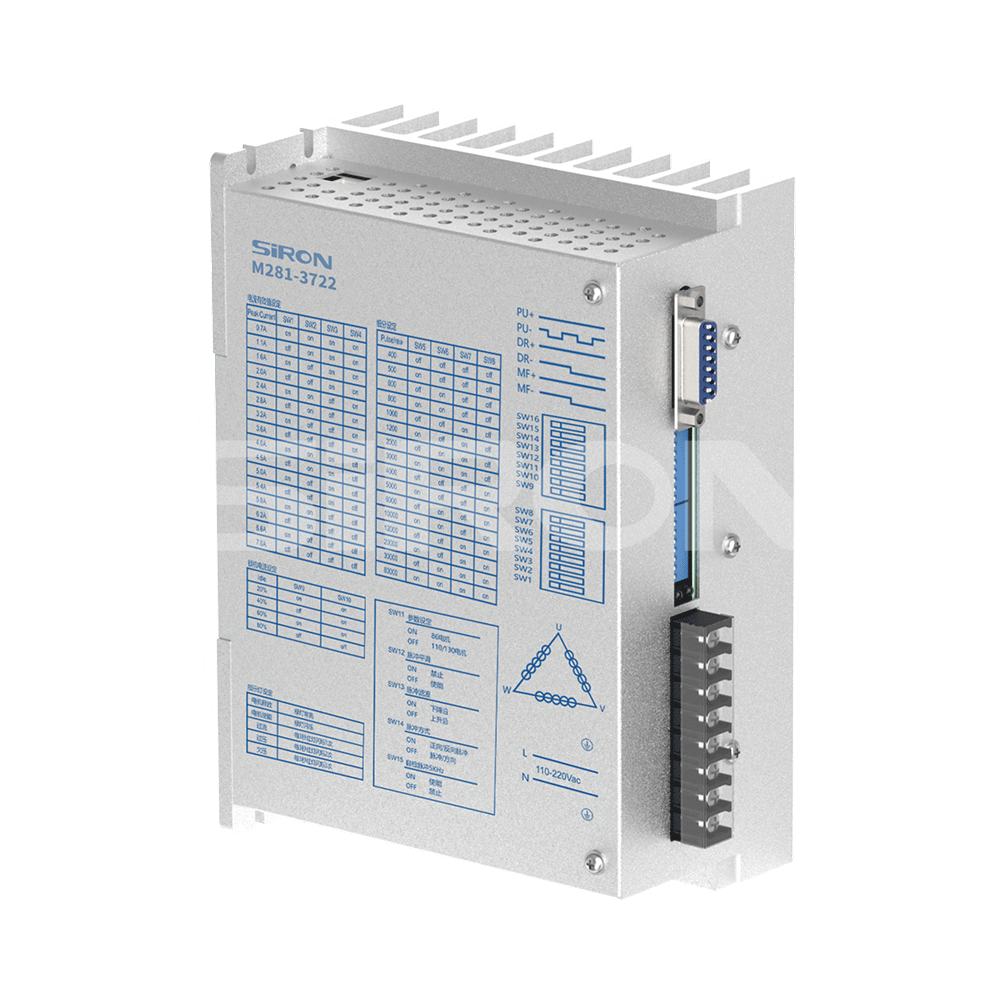 Selection example: M281-3722-C represents the M281 series three-phase open-loop digital stepper driver, with a voltage input range of AC110V to 280V, a maximum peak current of 7.0A, and a communication type of pulse type and economy type
