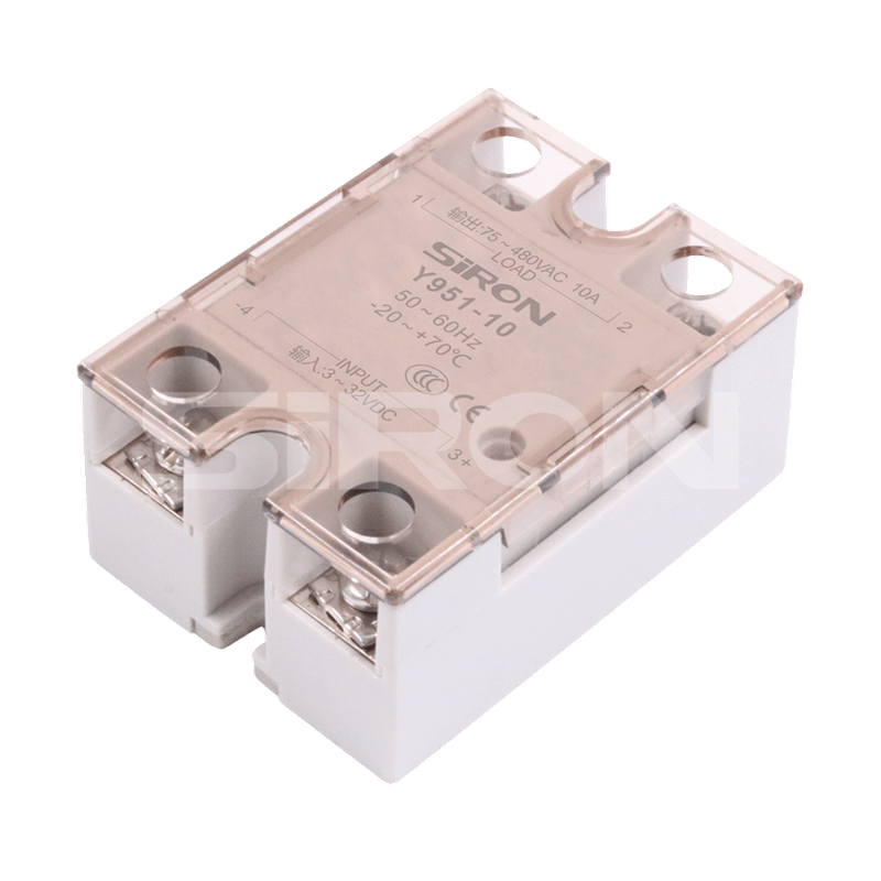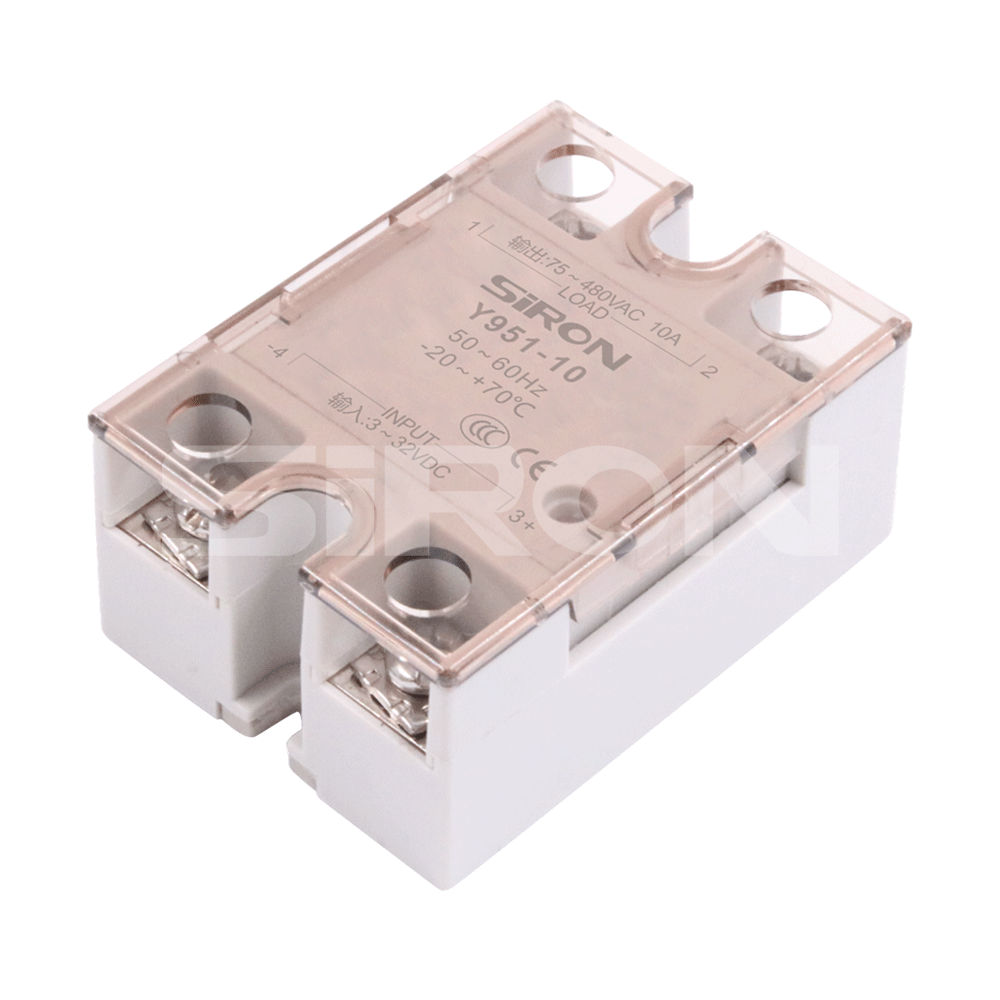 Selection example: Y951-10 Solid state relay, DC-controlled AC, load voltage 75~ 480VAC, output current 10A